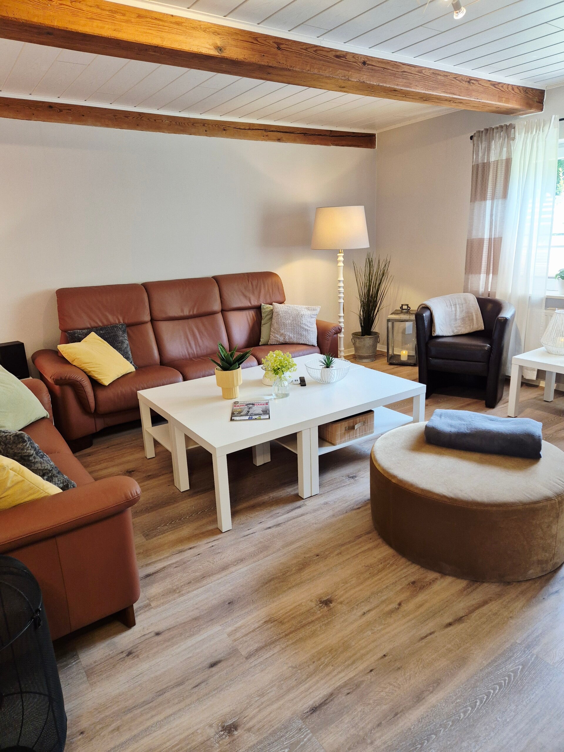 Unsere ebenerdige ruhige Ferienwohnung in Rodenäs in einem charmanten Reetdachhaus von 1860 in Nordfriesland bietet Dir drei gemütliche Schlafzimmer, ein großes Wohnzimmer, eine top ausgestattete Küche und ein modernes Badezimmer auf insgesamt ca. 110 qm. Die offene Balkenlage und andere kleine stilvolle Details vereinen "Hygge" (gelassene dänische Gemütlichkeit) mit rustikalem & modernem Design.