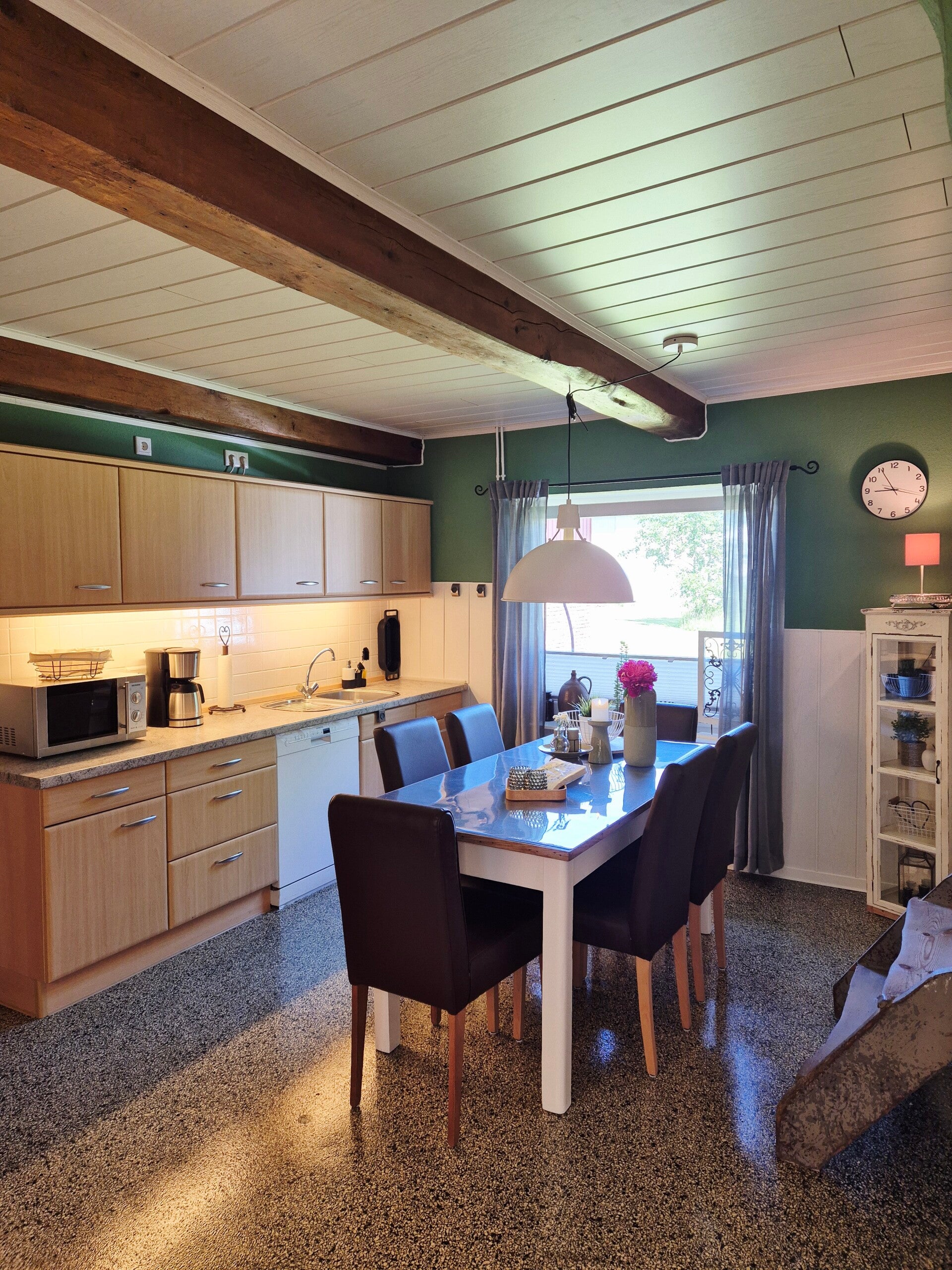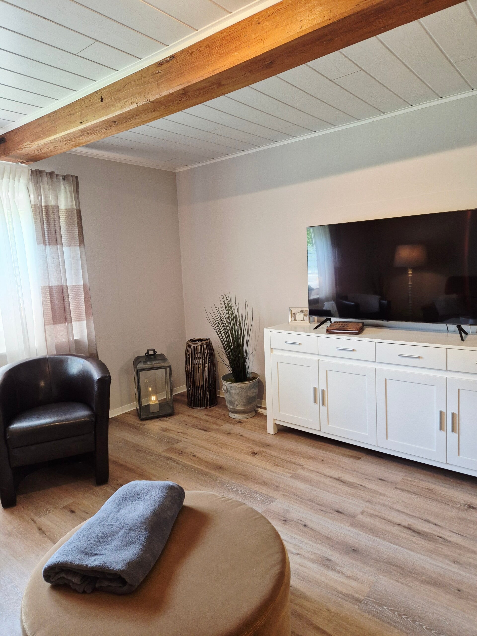 Die top ausgestattete Küche lädt zum gemeinsamen Kochen und Verweilen ein, während das große Wohnzimmer mit seinem Echtleder-Stressless-Sofa und dem großen Fernseher pure Entspannung verspricht. Erlebe das harmonische Zusammenspiel aus modernem Komfort und rustikalem Charme, ergänzt durch WLAN und insgesamt drei Fernsehern.
